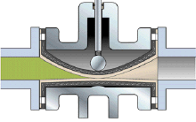 9、由于管套內(nèi)有一定角度排列的增強(qiáng)簾布層,使管套軸向和徑向壓力相互平衡,所以管套的長度與直徑不會(huì)因流體壓力而變化。當(dāng)控制介質(zhì)進(jìn)入管套與閥體之間的空腔時(shí),管套在介質(zhì)壓力下變形截流。